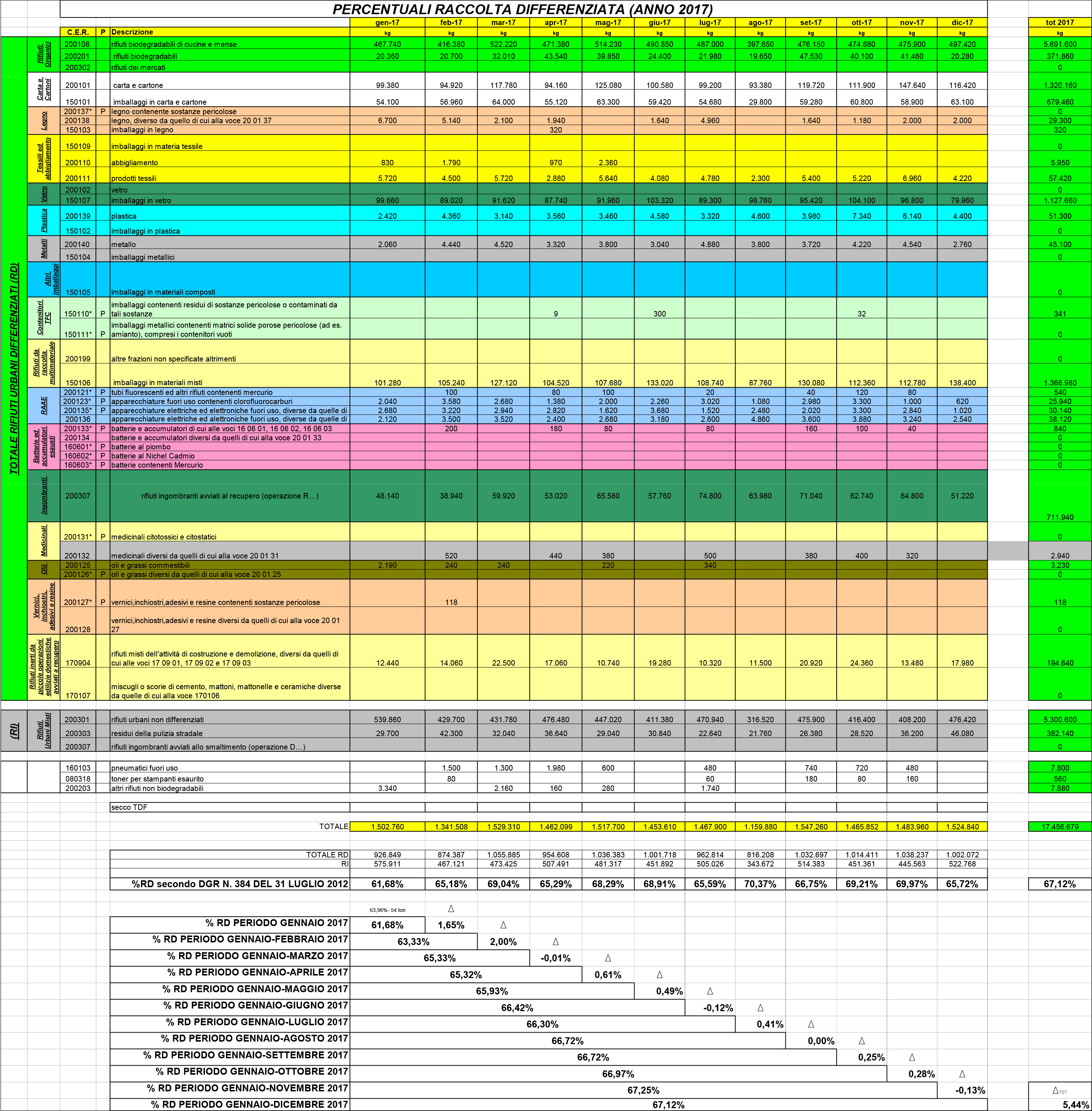 In questa Sezione vengono inoltre pubblicati mensilmente i report forniti dalla Società ENAM S.p.A. sui dati relativi alla Raccolta Differenziata dei Rifiuti Urbani Differenziati (RD), espressi in percentuale per mensilità, con media mensile, dall'inizio dell'anno: